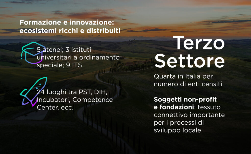 Infine, il terzo settore: con 10.975 enti censiti e una densità di 300 ogni 100.000 abitanti, la Toscana è quarta in Italia. Una rete di soggetti no-profit e fondazioni – tra cui 27 fondazioni di particolare rilievo – che rappresenta un tessuto connettivo importante per i processi di sviluppo locale.
